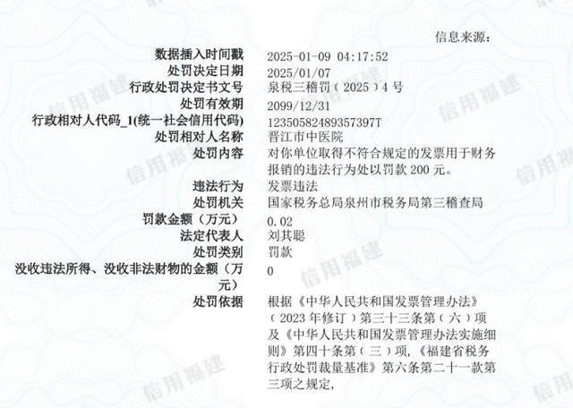 台海网1月10日讯 根据国家税务总局泉州市税务局第三稽查局近日发布的行政处罚信息公开表(泉税三稽罚(2025)4号)显示,因取得不符合规定的发票用于财务报销,对晋江市中医院处以人民币200元罚款。